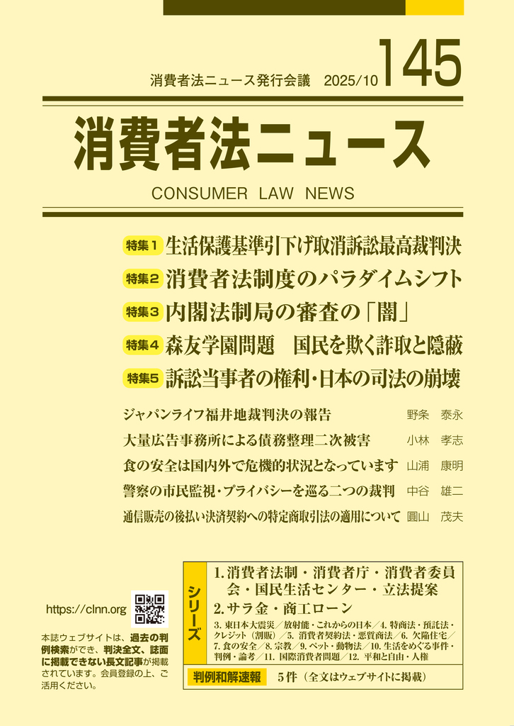ホーム 判例和解速報 巻頭言 バックナンバー 文献紹介 新聞情報 諸団体行事予定表 Tweet 最新号詳細 145号(2025年10月発行) 今号の特集と主な見出し 特集1 生活保護基準引下げ取消訴訟最高裁判決 特集2 消費者法制度のパラダイムシフト 特集3 内閣法制局の審査の「闇」 特集4 森友学園問題 国民を欺く詐取と隠蔽 特集5 訴訟当事者の権利・日本の司法の崩壊 最新号の目次はこちら Table of Contents(pdf) トピックス 【速報】「レンタル彼氏」事件:GOLDMINE社の上告は棄却、東京高裁判決が確定しました2025年11月18日 お詫びと訂正(145号)2025年11月11日 「消費者法ニュース」145号を発行致しました。2025年11月6日 お詫びと訂正(142号)2025年10月22日 「消費者法ニュース」144号を発行致しました。2025年8月8日 トピックス一覧 事務局からのお知らせ 第31回消費者問題リレー報告会のご案内2025年10月29日 2025消費者法ニュース大阪リレー報告会・「みなし貸金業の立法を求める全国連絡会」結成総会のご案内2025年7月23日 第30回消費者問題リレー報告会のご案内2025年1月21日 購読料等の改訂のお願い2024年11月7日 消費者法ニュース大阪リレー報告会のご案内 (7/22更新)2024年6月24日 事務局からのお知らせ一覧