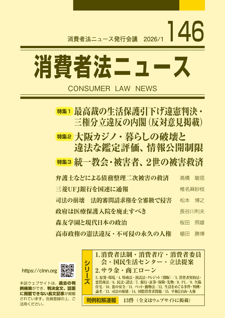 ホーム 判例和解速報 巻頭言 バックナンバー 文献紹介 新聞情報 諸団体行事予定表 Tweet 最新号詳細 146号(2026年1月発行) 今号の特集と主な見出し 特集1 最高裁の生活保護引下げ違憲判決・三権分立違反の内閣(反対意見掲載) 特集2 大阪カジノ・暮らしの破壊と違法な鑑定評価、情報公開制限 特集3 統一教会・被害者、2世の被害救済 最新号の目次はこちら Table of Contents(pdf) トピックス 「消費者法ニュース」146号を発行致しました。2026年2月2日 【速報】「レンタル彼氏」事件:GOLDMINE社の上告は棄却、東京高裁判決が確定しました2025年11月18日 お詫びと訂正(145号)2025年11月11日 「消費者法ニュース」145号を発行致しました。2025年11月6日 お詫びと訂正(142号)2025年10月22日 トピックス一覧 事務局からのお知らせ 第31回消費者問題リレー報告会のご案内2025年10月29日 2025消費者法ニュース大阪リレー報告会・「みなし貸金業の立法を求める全国連絡会」結成総会のご案内2025年7月23日 第30回消費者問題リレー報告会のご案内2025年1月21日 購読料等の改訂のお願い2024年11月7日 消費者法ニュース大阪リレー報告会のご案内 (7/22更新)2024年6月24日 事務局からのお知らせ一覧