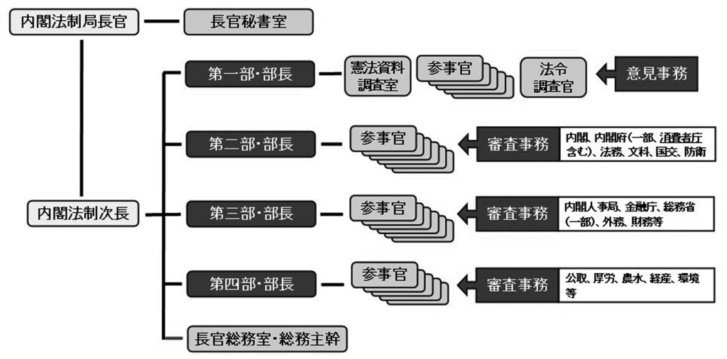 組織構成は、内閣が任命するその長である内閣法制局長官3のほか、内部部局として、意見事務を行う「第一部」、審査事務を行う「第二部」「第三部」「第四部」等がある(法4条。図1参照)。職員として、内閣法制次長、参事官、事務官が配置されるが、各部における業務は、参事官が担当する(法5条)。各部の参事官は他省庁からの出向者が担っている4。消費者庁の所管する法令案の審査を担当するのは「第二部」で(内閣法制局設置法施行令2条)、実際には法務省出身の参事官(検察官併任。特に元裁判官)が審査にあたっているものと思われる5。